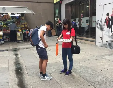 永安旅遊義工同事手持印有東華三院徽號的橙色旗袋,積極地向市民勸銷紙旗。