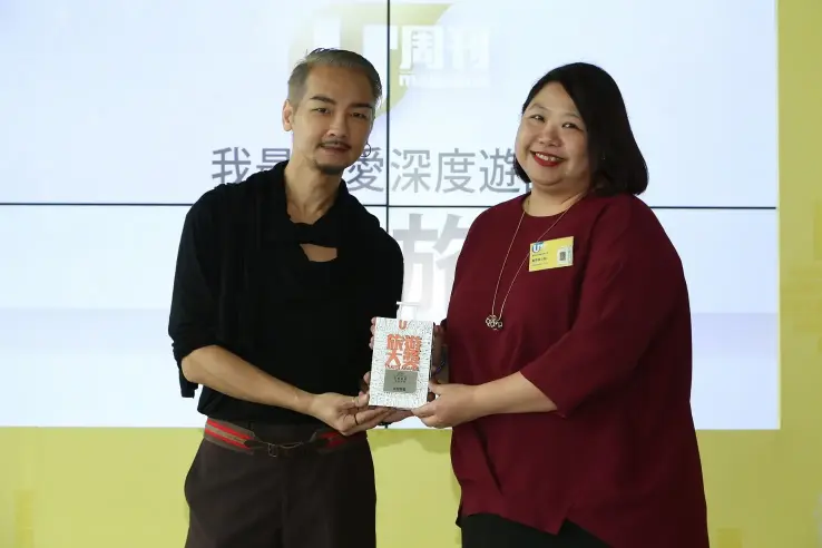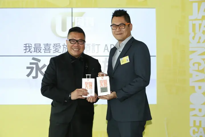 | 泰國通胡慧沖先生(左)任頒獎嘉賓,由永安旅遊高級產品經理-自由行業務部陳廣業先生(右)代表公司領取獎項。 |