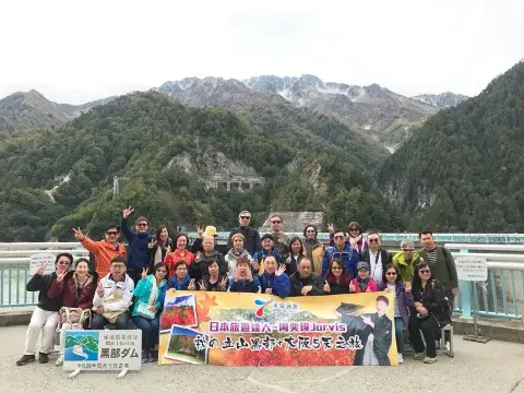 | 星級嘉賓Jarvis (下左七)與永安旅遊貴賓於立山黑部大合照。 |
