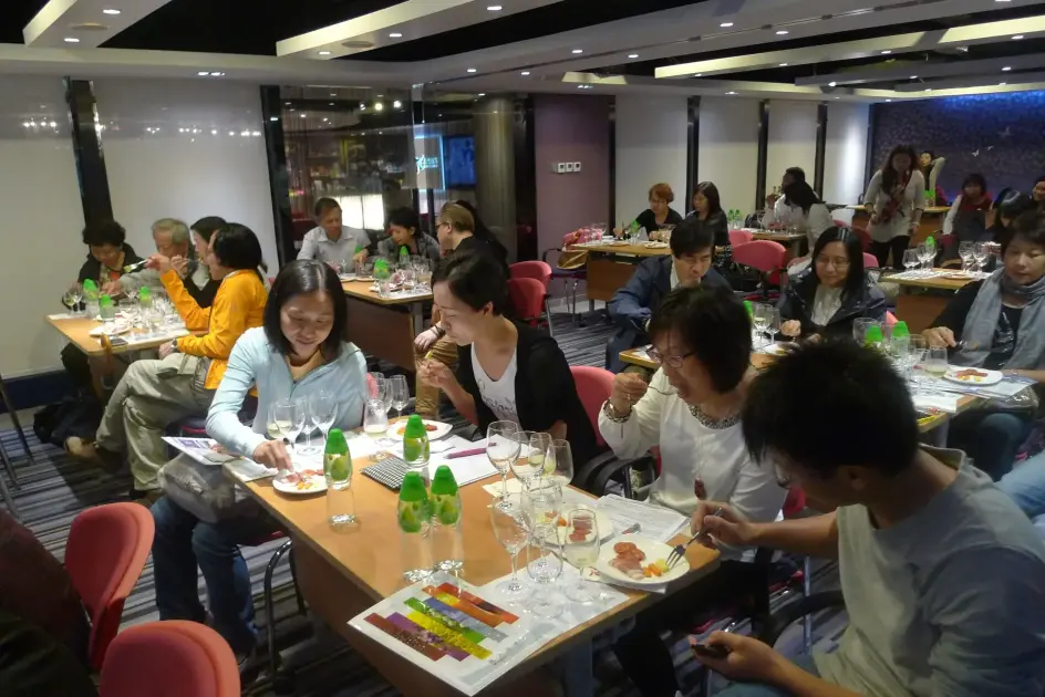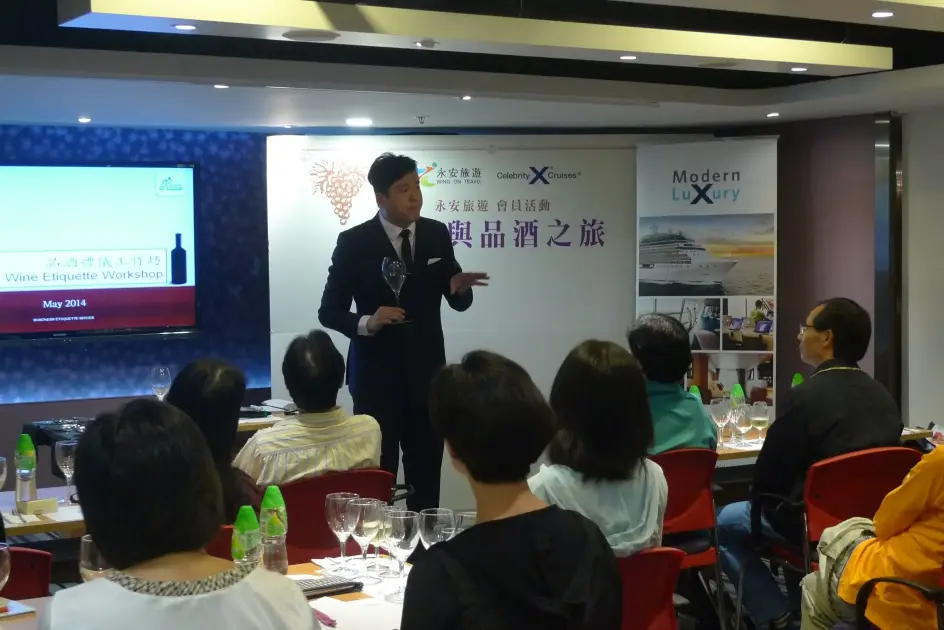 著名禮儀培訓專家梁迦傑博士教授品酒及餐桌禮儀。