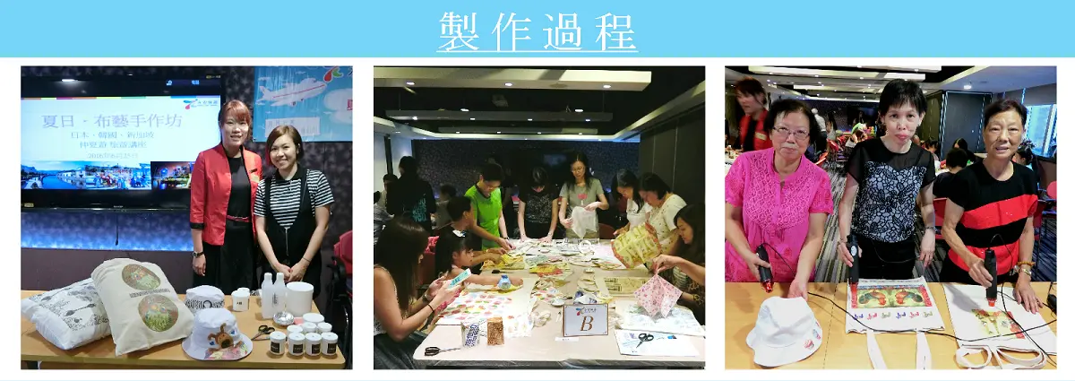 活動當天由領隊Carol為會員介紹暑期熱門的旅遊資訊,讓各位會員為暑假出遊做足準備。其後由導師教授會員利用「蝶古巴特」的手工藝方式,在預先挑選的布藝產品上拼貼圖案。會員從50款各式各樣的圖案中精挑細選,從而設計出個人獨特的主題風格,如旅行遊世界、黑白復古配搭或色彩繽紛的卡通風格等。各位小朋友、大朋友親手完成作品後,都急不及待與其他參加者分享,玩得不亦樂乎。