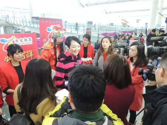 永安旅遊董事兼行政總裁梁港蘭親自前往機場向傳媒朋友拜年及接受專訪。