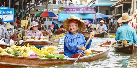 丹嫩沙多水上市場是曼谷著名的集市之一。這是至今唯一依然保持著泰國昔日水上集市風貌的集市。其中,托木肯集市的熱鬧景象,值得遊客一看。當地人們戴著獨特的草帽,大聲地吆喝叫賣,別有一番風情。