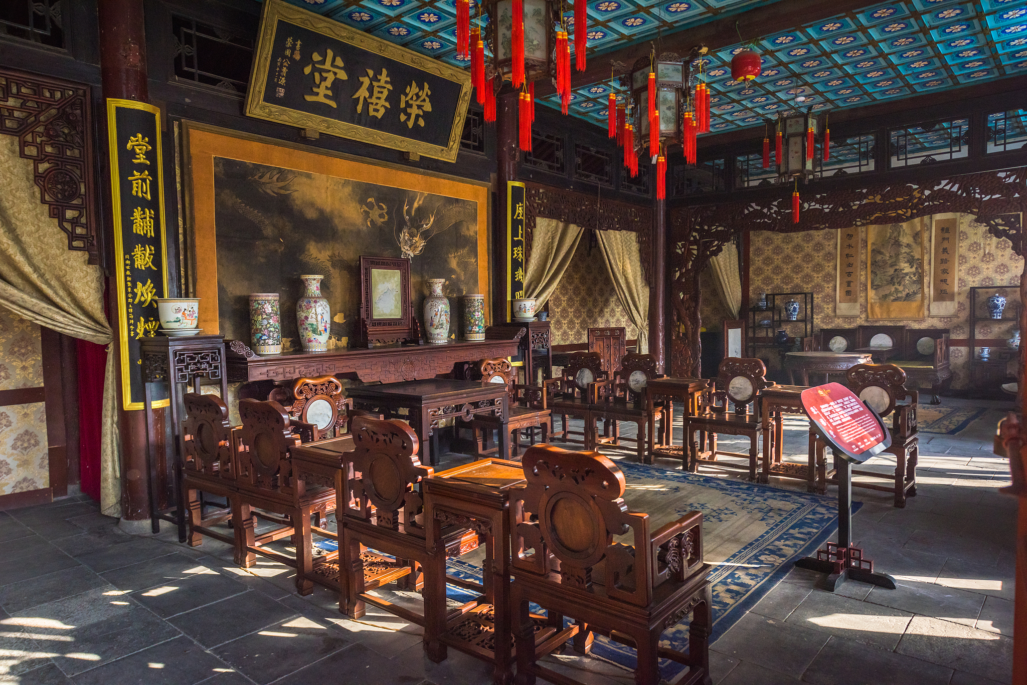 府內西側怡園內的四季花亭古色古香,小橋迂迴山水俱全,宛如一座精巧別緻的蘇州園林。後圍房內新增設了《紅樓夢詩詞繪畫、刻石展》,邀請了啟功、張愛萍、黃琦、歐陽中石等二百餘位著名書法家揮毫潑墨。