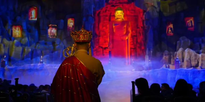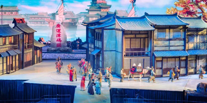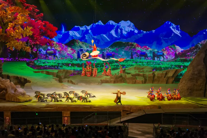 會跑的實景演藝《駝鈴傳奇》秀,首創旋轉行走式觀眾席,將現代高新科技與駝道絲路的傳奇歷史文化經典相融合,為觀眾帶來超凡的視覺體驗和心靈震撼,以正能量傳播西安輝煌歷史時期的文化傳奇。