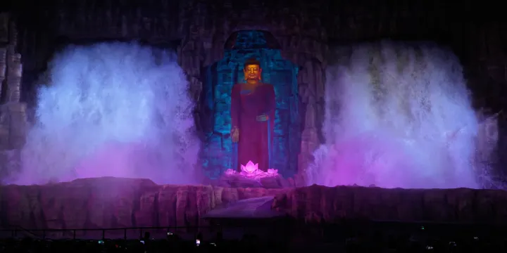 會跑的實景演藝《駝鈴傳奇》秀,由華夏文旅集團董事長夏春亭擔任總策劃、總編劇、總導演。在編撰《駝鈴傳奇》秀的過程中,以「一帶一路」為主線,深入挖掘大唐傳統文化,追尋駝隊絲綢之路上的蹤跡,以正能量傳播西安輝煌歷史時期的文化傳奇。整場演藝分為《送君千里》、《狼道遇險》、《異國風情》、《祥雨洗塵》、《迎郎歸來》、《華夏盛世》劇情,以「好看、好聽、好玩」為宗旨,打造出一部面向大眾、雅俗共賞、喜聞樂見、大快人心的演藝。演出情節設計以一對新婚燕爾的夫妻依依惜別開場,講述西行駝隊一路經歷火山、雪崩、風沙、大漠等自然險阻以及狼群突襲,九死一生;隨後滿載貨物返程,途中祈福巴米揚,巧遇天降聖水,在親人的期盼中安然回到長安。期間穿插描述與體現異域風土人情,整場演出跌宕起伏,為觀眾帶來震撼、刺激、唯美、歡快的視聽感受,使用發明專利多達47項,20峰駱駝、30匹蒼狼在其中也有驚險刺激的表演。《駝鈴傳奇》秀帶你穿越漠風沙的豪邁與蒼茫,傾聽絲綢之路上悠遠駝鈴的清脆與神秘,品味異域風情,見證榮耀大唐,聆聽華夏千年回響。
