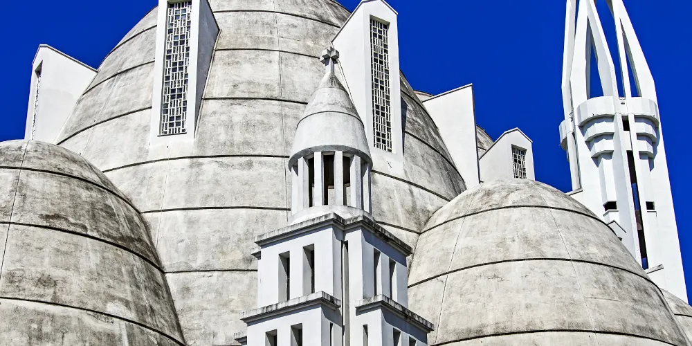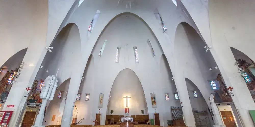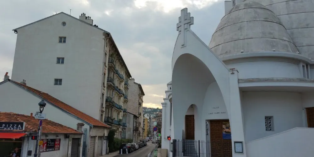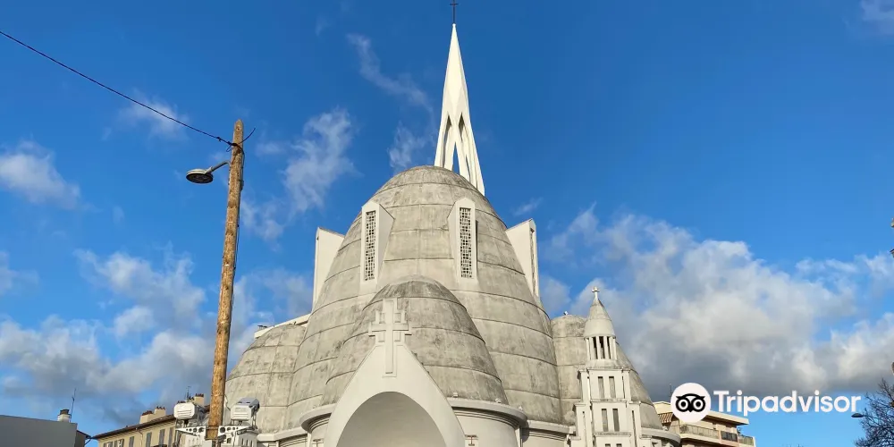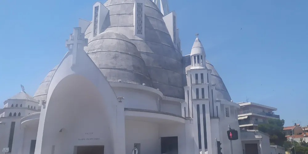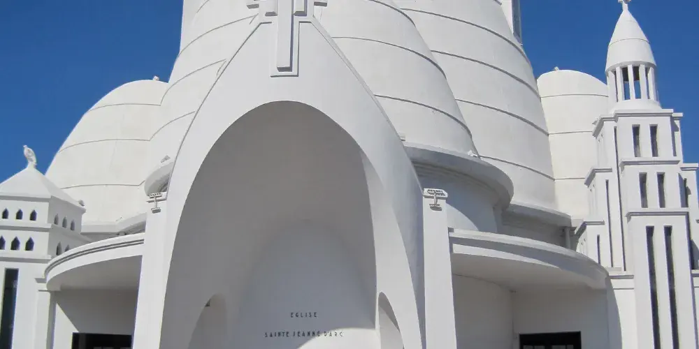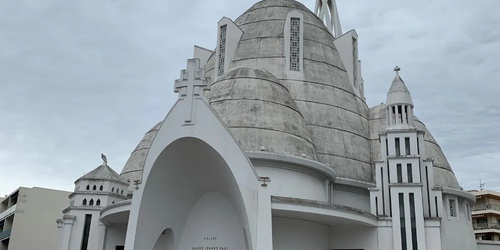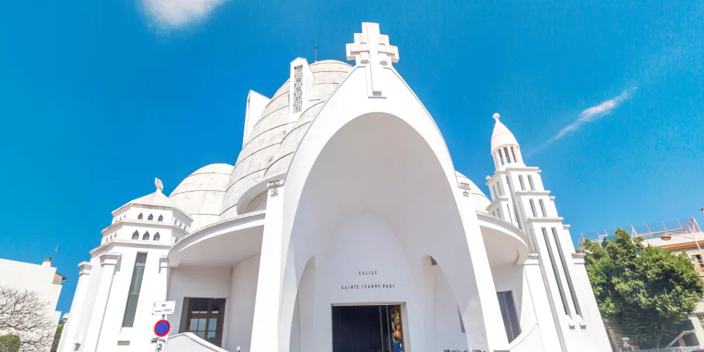 聖女貞德教堂是尼斯供奉聖女貞德的天主教堂,建於1926-1933年間,擁有三個曲線圓頂和65米高的鐘樓,因外立面被全部粉刷成白色,故獲得了“蛋白”的暱稱。這座鋼筋混凝土教堂是由建築師雅克·德羅斯設計建造,三個曲線圓頂使其獲得了驚人的內部空間,65米高的鐘樓與圓頂的曲線相對,室內的繪畫受俄羅斯立體派和東正教繪畫的影響,整個建築十分當代,吸引了無數遊客。