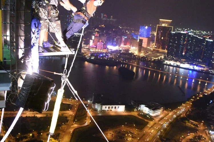 澳門塔高達338米,是澳門的地標之一。如果想讓你的澳門之行獨特而難忘,可以前往位於澳門塔的61層,體驗一次澳門觀光塔“笨豬跳”,也就是蹦極跳。從233米的高空一躍而下,等到纜繩完全延伸後,還會再次被反彈到30米的高空,經過數次之後,慢慢著陸於特設的安全氣墊上。挑戰成功後還將獲得證書、會員證和“笨豬跳”T卹。