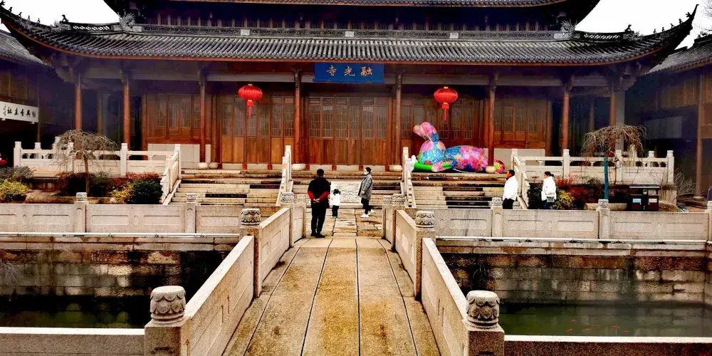 魯鎮位於紹興柯岩風景區內,是依照魯迅筆下的「魯鎮」還原的主題公園。在這裡你會看到許多熟悉的場景:魯家祠堂、奎文閣、阿Q棲身的土谷祠等等,可以一路走一路回憶作品中的橋段,是種特別的體驗。魯鎮被流水大致分為三部分,景區的入口,迎面是一座高大的石牌坊,上書「魯鎮「二字」,一旁是魯迅先生坐在藤椅上的銅像,頗有「橫眉冷對千夫指,俯首甘為孺子牛」的神韻,也是魯鎮的中軸線上係民俗風情街、雙面戲台,左手邊有趙府、土穀祠、奎文閣,右手邊則有靜修庵、百匾館、魯府(魯家花園)、魯家祠堂、當鋪、錢府(狂人府)等,各部分之間有小橋相連,河道中不時有烏篷船划過,頗有情趣。魯鎮不大,順著標識步行遊玩即可。首先來到的是民俗風情街,這裡是魯鎮繁華的地方,沿街有許多特色小店,售賣一些古玩玉器和烏氈帽之類的小玩意,街上還有遊客可以參與的「投球入樽」、「套圈」等紹興特色的遊戲,感興趣可以去玩一玩。風情街盡頭是魯鎮的中心,雙面戲台,遊客可以在這裡看社戲、品黃酒(社戲表演時間參考當日戲台附近的公告牌)。戲台往左來到阿Q的棲身之所土谷祠,再往裡走便是魯鎮較高的建築奎文閣,登上樓去,可以俯瞰魯鎮全景。過橋來到錢府,這裡按照《狂人日記》裡的情節,佈置了一個「吃人」而扭曲的環境,尤其是走進蠕洞裡,好像走進動物的腔腸內部,有種被封建禮教吞噬的即視感。從錢府開始往景區大門方向走,沿路是當舖、《祝福》中的魯家花園、阿Q調戲小尼姑的靜修庵等等,過靜修庵前的石板橋,便出了魯鎮的廣場了。除了這些建築,魯鎮街上穿著戲服扮演魯迅筆下角色的演員們也是魯鎮一道風景,阿Q油腔滑調地裝各種怪相,祥林嫂挎著討飯籃拄著竹竿在街上四處遊蕩……讓人感覺真的穿越進了魯迅的故事裡。遊客多時,他們就扮演起自己的角色,念起經典台詞來逗遊人開心,引得遊客紛紛掏出相機拍照。柯岩風景區有柯岩、魯鎮兩個入口,可以先遊玩魯鎮乘畫舫前往葫蘆酒島,然後去到柯岩景區看天工大佛。或者從柯岩進入景區,沿柯岩-鑑湖-魯鎮遊玩。