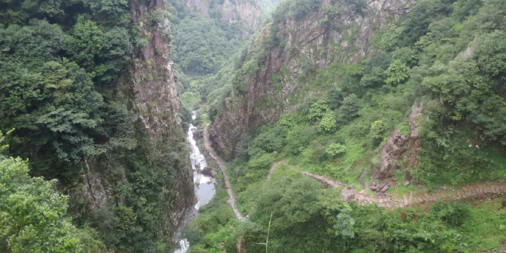百丈青峽谷位於牛頭山湖入口處南側,兩邊山谷陡削險峻、峯巒奇特、奇巖怪石眾多,飛瀑氣勢雄偉,龍潭英姿秀美,潭瀑相連似百丈青紗摺疊飄流而下,故名“百丈青”。過峽谷口,展現眼前的是一片一萬多平方米、碧波蕩漾的百丈青水上樂園,讓人神新氣爽。水邊的亭台樓榭、休閑茶園,為遊客提供了駐足觀賞的場所。