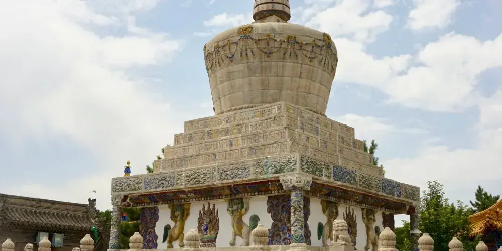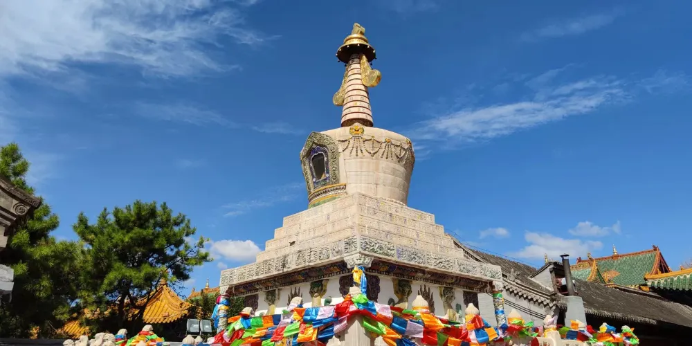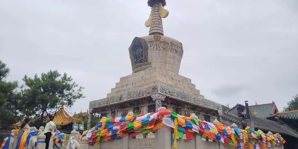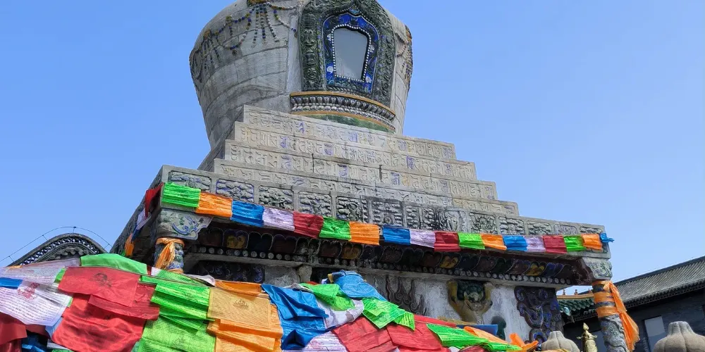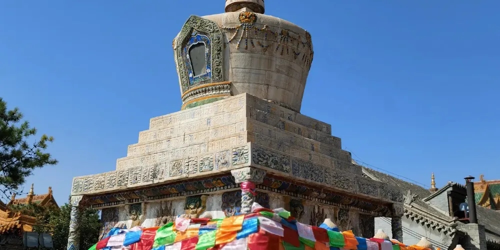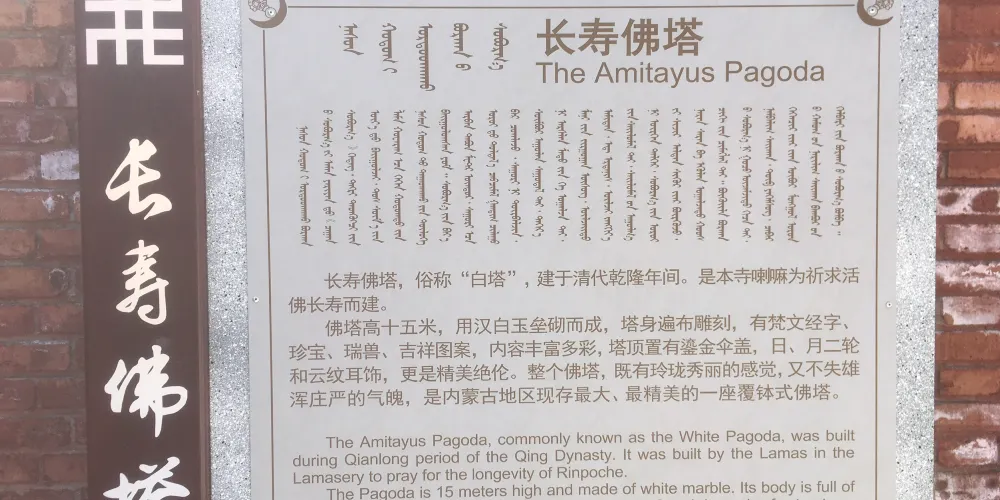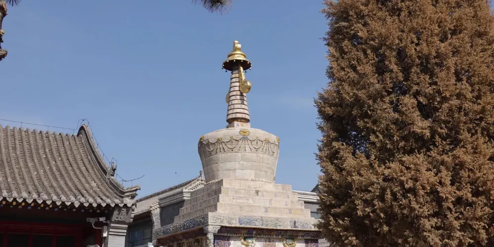 長壽佛塔,俗稱“白塔”,建於清代乾隆年間。佛塔高十五米,用漢白玉壘砌而成塔身遍佈雕刻,有梵文經字、珍寶、瑞獸、吉祥圖案、內容豐富多彩,塔頂置有鎏金傘蓋,日、月二輪和雲紋耳飾,更是精美絕倫。