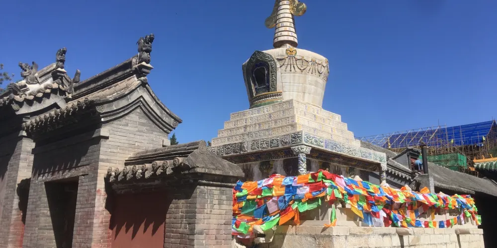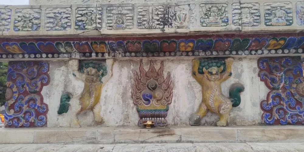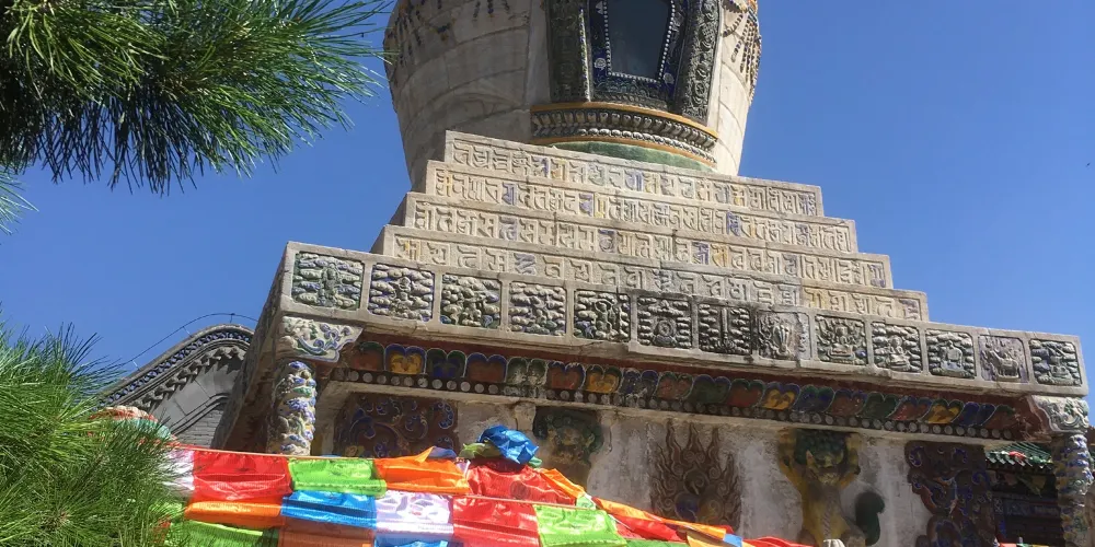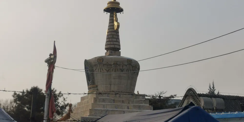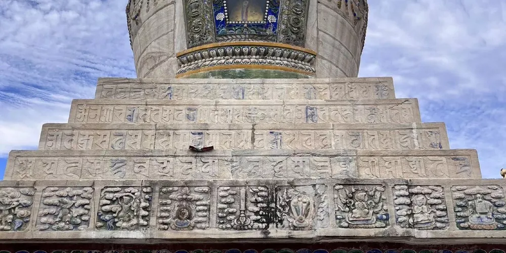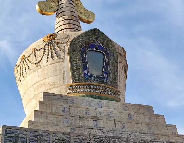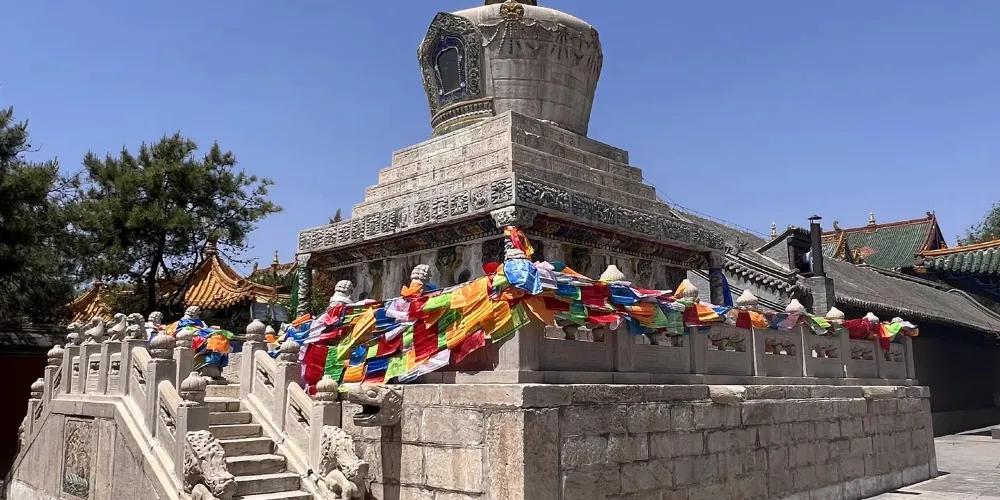 長壽佛塔,俗稱“白塔”,建於清代乾隆年間。佛塔高十五米,用漢白玉壘砌而成塔身遍佈雕刻,有梵文經字、珍寶、瑞獸、吉祥圖案、內容豐富多彩,塔頂置有鎏金傘蓋,日、月二輪和雲紋耳飾,更是精美絕倫。