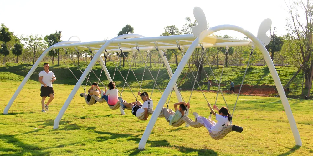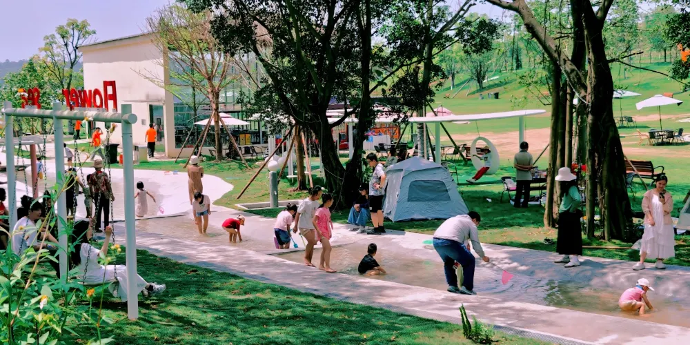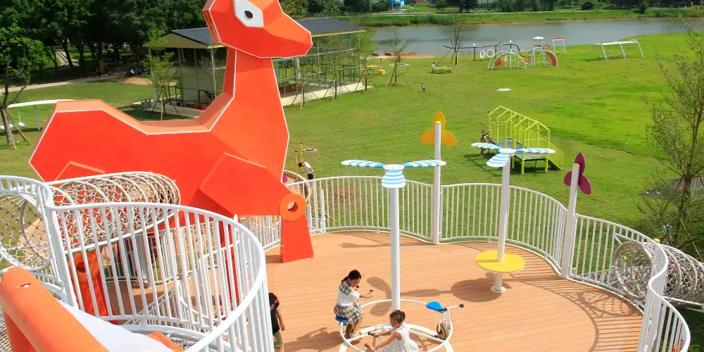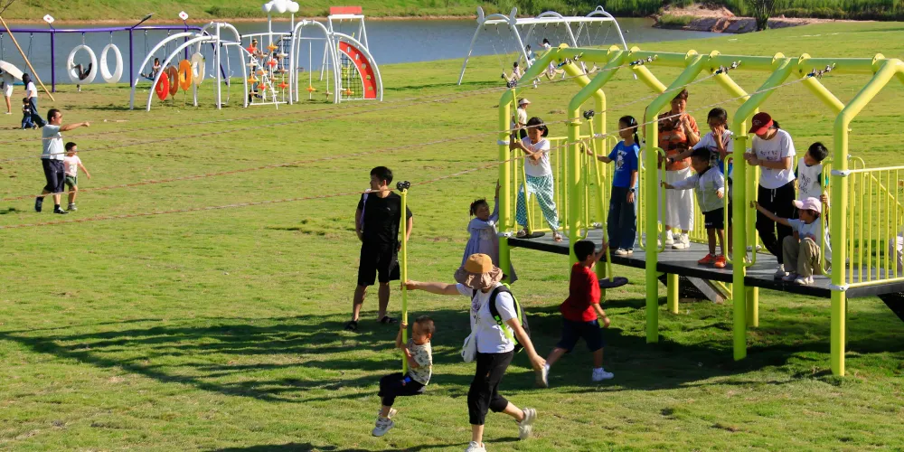 兒童遊樂天地!木質攀爬架、鮮橙滑梯、沙池尋寶、鞦韆矩陣等設施均以自然材質打造,融入地形與植被,讓孩子在安全探索中鍛鍊體能、激發想像力。