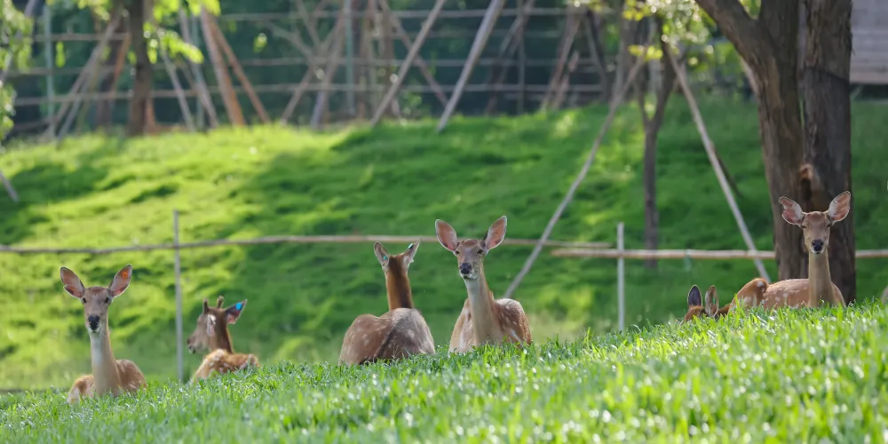 湖畔半島生活著溫馴梅花鹿群,夏季鹿身白斑尤為清晰明艷,毛色如雪中落梅。遊客可用乾玉米粒投餵,看小鹿輕蹭掌心,或靜坐觀景台欣賞鹿群飲水、夕陽映湖的靜謐畫面。