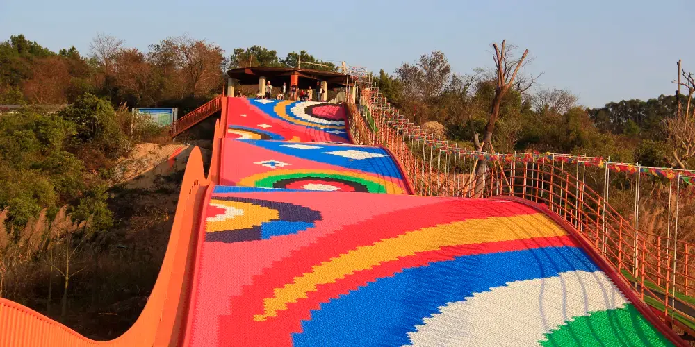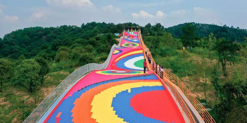 260米大灣區超長的七彩滑道依山勢而建,乘坐橡皮圈從雲端俯衝而下,感受速度與色彩的激情碰撞,適合全年齡段挑戰。
