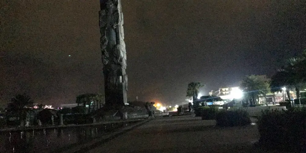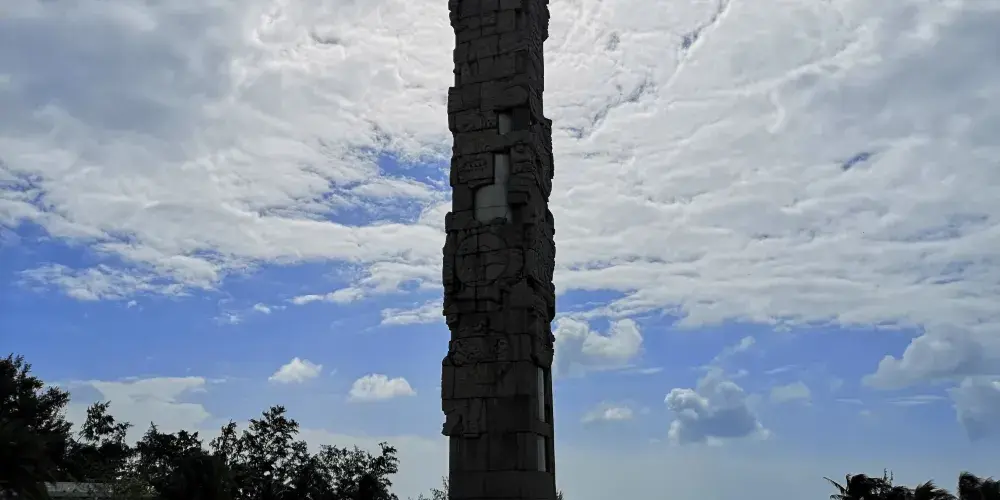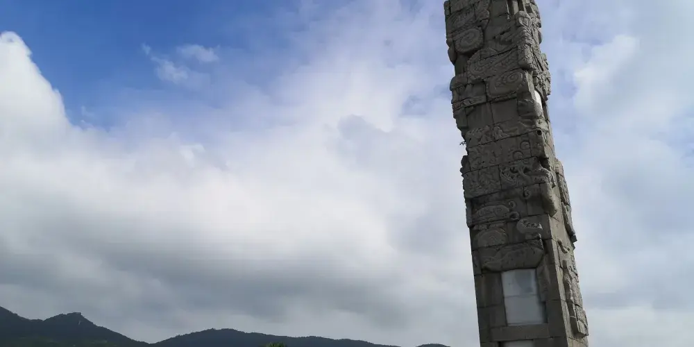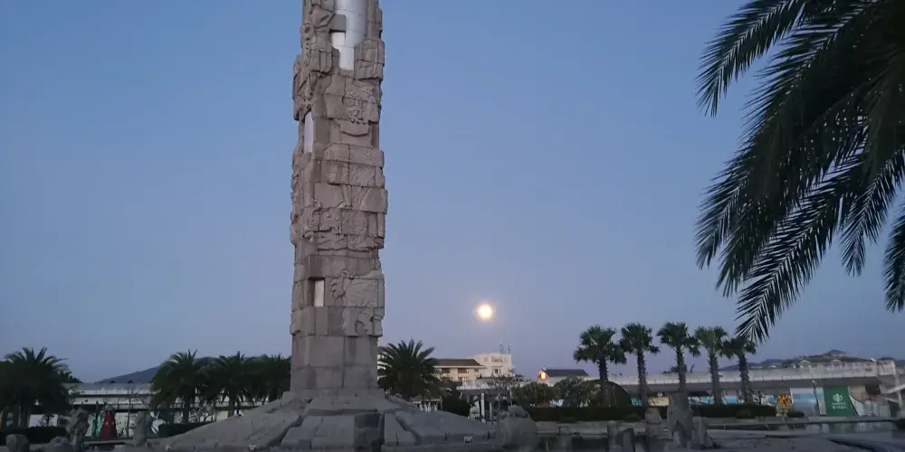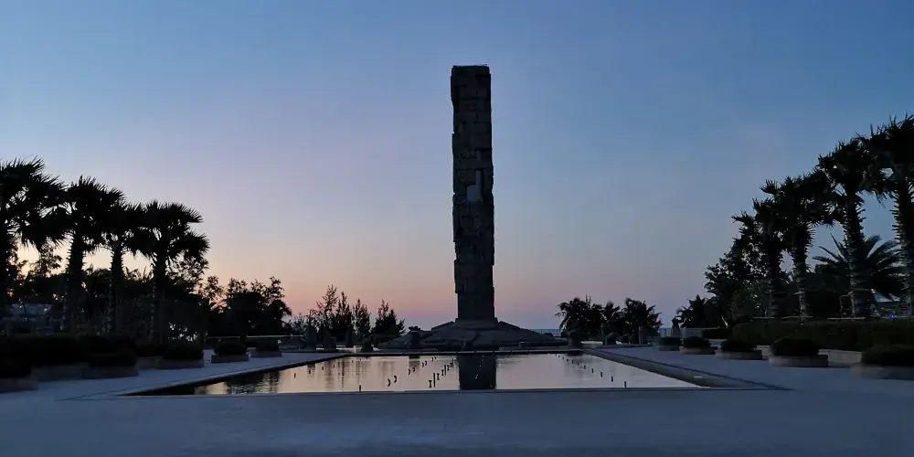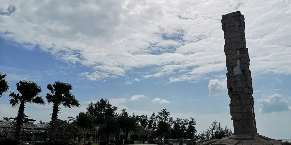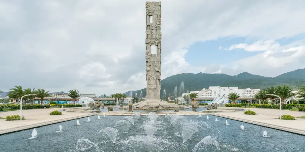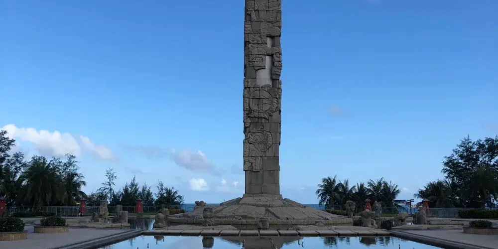 圖騰柱在亞龍灣中心廣場內,和其周邊圍繞的中心雕塑區形成三圈石陣,每一圈石陣都有其獨特意義,給人以向藍天升騰和向大海延伸的視覺體驗。圖騰柱造型裡面是圓形外面是方形,上面所雕刻的圖像圍繞著柱子盤旋向上。廣場外圍有的五組白色風帆式的尖頂帳篷及大型彩色噴泉,給文化意蘊深厚的雕塑又增添了不少現代氣息。
