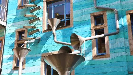 光雨庭其實是座圍牆,圍牆上佈滿瞭如交響樂團喇叭的排水管,彎彎曲曲、延伸在藍色的樓外。在安靜的情況下,豎起耳朵可以傾聽流水打在管子上的清脆聲響;有“光”則是因為在牆面上還佈滿了捲曲的金屬薄片,陽光耀眼時,各個小影子點綴在牆面上。