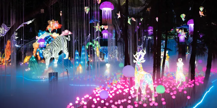 《山海經》和《阿凡達》主題大型燈光展在夜晚為沉浸式觀眾提供了獨特的視覺體驗,璀璨燈光將暗夜點亮成絢麗的夜晚。