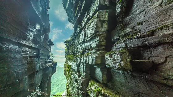 則評價這裏左右兩邊都有陡峭的石壁,衹能從縫隙中看到藍天,山勢險峻,是一處自然的奇觀。