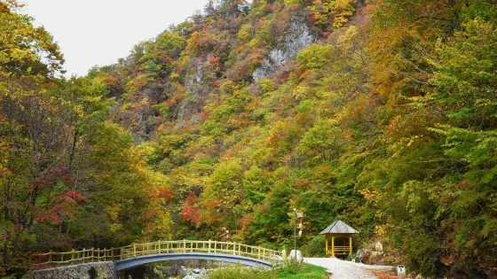 在長白山沿線巍峨壯麗的崇山峻嶺中,俊美秀麗的金銀峽顯得獨樹一幟。這裏山峯稱奇、峽谷傳神、溪水涓秀、瀑布豪放。春天,羣峯披綠,山花爛漫;夏天樹木成蔭、流水傳情;秋天,紅葉滿山、野果遍野;冬天,銀裝素裹、聖潔如玉。一年四季都是旅遊的好去處。漫步金銀峽長達7.5公里的峽谷中,近看小河潺潺,清澈見底,亭榭小橋立綴其上,玲瓏雅緻,景色絕佳;遠觀奇峯突起,危崖壁立,樹木扶疏,紅葉艷美,層林盡染。沿着盤旋曲折的山間石階,溪水歡唱,一步一景。一路上,可欣賞到天聖泉瀑布、葯王谷、古棧道、一線天、卧熊石、神龍洞、點將台、高峽湖等景觀。