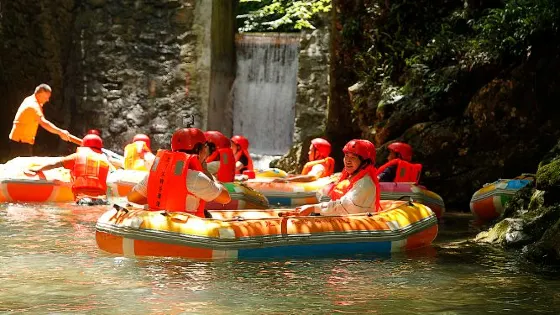 水墨汀溪風景區以原生態的自然風光為主,流水和竹林伴隨著步道,不時能見到瀑布,也有漂流、滑翔傘這樣的遊樂設施,適合週末休閒遊。你可以選擇坐觀光車到深處,一路看山看水,如果想要尋求刺激,可以玩一下吊在滑索下的滑翔傘,感受下迅疾的風速帶來的快感。