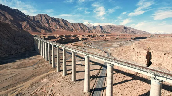 則評價雄奇壯觀的青藏鐵路三岔河特大橋聳立在有名的玉珠峯北側,位於青藏高原小南川和野牛溝匯合處。大橋海拔3800多米,全長690.19米,橋面距谷底54.1米,共有20個橋墩,其中有17個是圓形薄壁空心墩,墩身頂部壁薄處衹有30釐米。為保護藏羚羊,特意做了方便藏羚羊遷徙的設計。整個大橋氣勢磅礴、雄偉壯麗,兩岸風光壯美。