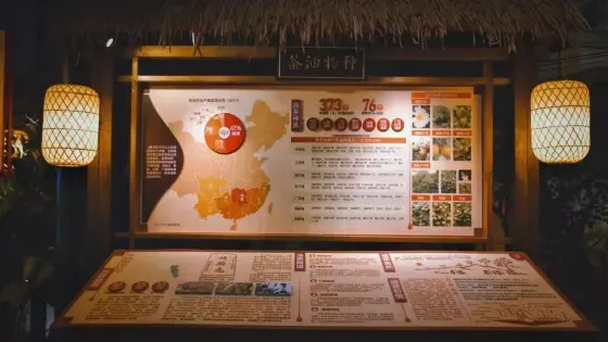 亞美油茶博物館佔地超過1800平方米,全面呈現了千年油茶的發展歷程。館內圍繞茶油的起源、品種分類、種植方法以及壓榨工藝與設備等主題系統展示,並融入裸眼5D、VR沉浸體驗和全息影像等一系列前沿科技,生動再現茶油從原料到成品的完整製作流程。