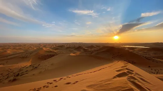 騰格里沙漠月亮湖位於內蒙古自治區阿拉善盟阿拉善左旗境內,當地牧民稱之為“月亮湖”、“中國湖”,因為該湖從東邊看像一輪彎彎的月亮,從西邊沙丘上看像一幅中國地圖。月亮湖周圍景色十分漂亮,並且是沙漠探險的好地方。在景區內可以乘坐越野車進入沙漠的中心地帶探險,也可以騎騎駱駝、參加野營燒烤等,非常有趣。
