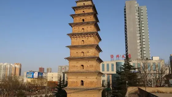 精進寺塔又名寶塔,位於澄城縣城東大街與長寧街交匯處西南角文化館院內。此處原有一座寺院名精進寺,現僅存這座建於唐代的古塔。精進寺塔是一座方形九級樓閣式空心磚塔,通高33.26米,塔基每面邊長7米。從外觀造型看,它與西安大雁塔有些相似,但其塔身為仿木結構,柱頭突出疊檐清晰,塔頂鐵剎,剎座為仰覆蓮瓣形。塔身一層較高,塔正門向南,從此門進入可登塔(塔門並不常開)。塔內一層是木旋轉式樓梯,其它幾層均為木爬式樓梯,到第六層為止。古塔和縣城西大街的城隍廟神樓遙相呼應,是澄城縣的兩大標誌性景點。