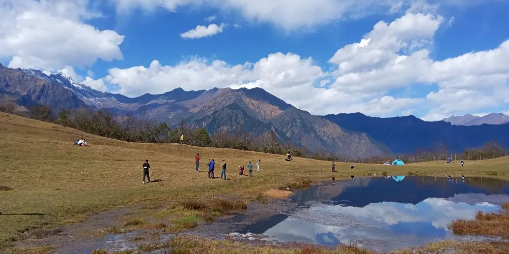 甘海子學名芳草海,位於松潘縣和九寨溝縣交界處的弓杠嶺,在九寨溝回成都的路旁能夠看到。這裡原是一處高山湖泊,後因地質變化,出水口擴大,所以當地百姓俗稱「乾海子」。其實,「乾海子」並不乾,這裡四周遠山層疊,森林茂密,海子中溪水蜿蜒,芳草萋萋,如天鵝絨地毯鋪滿大地,夏秋季野花點綴其間,牛羊騾馬成群,冬春時則一片深黃,與周圍的雪山紅葉相映成趣。因此,人們逐漸就把「乾海子」叫成了「甘海子」。