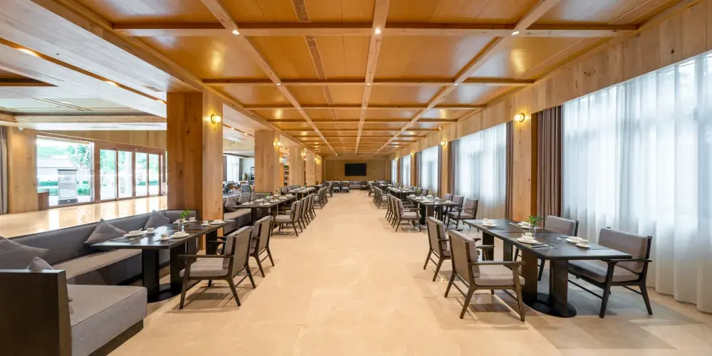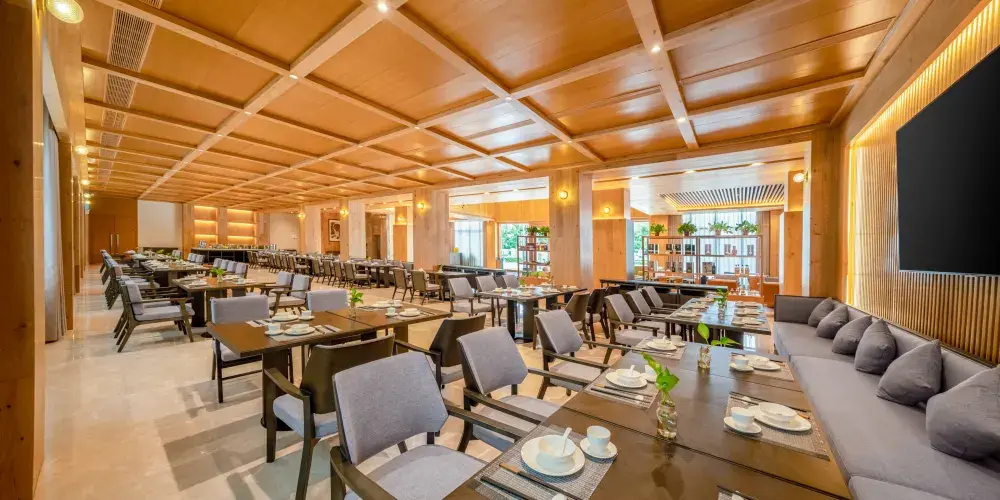 餐廳服務:綜合商業中心是度假村主要用餐區域。綜合商業中心共四層,一樓是自助餐廳,二樓是宴會廳和包廂,主要有5個包廂,4個小包廂,1個可容納20人就餐的大包廂。餐廳目前可同時容納360人就餐。三樓會議室,可同時容納200人左右的會議,餐廳以客家農家菜為主打菜式,以健康、美味、休閑為宗旨,為遊客提供具有當地特色和文化的菜品,全力滿足各地不同遊客的用餐需求。