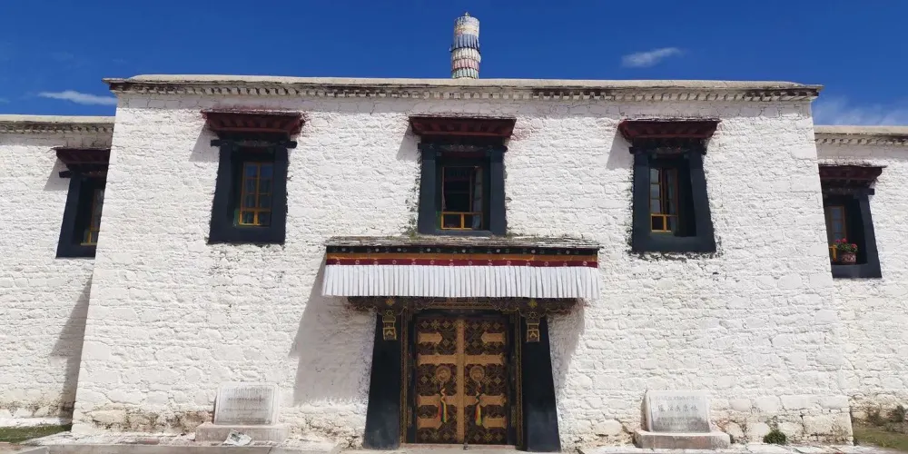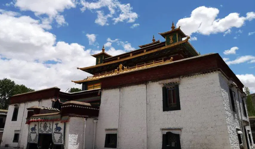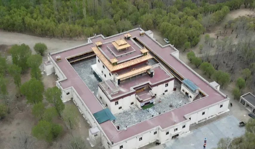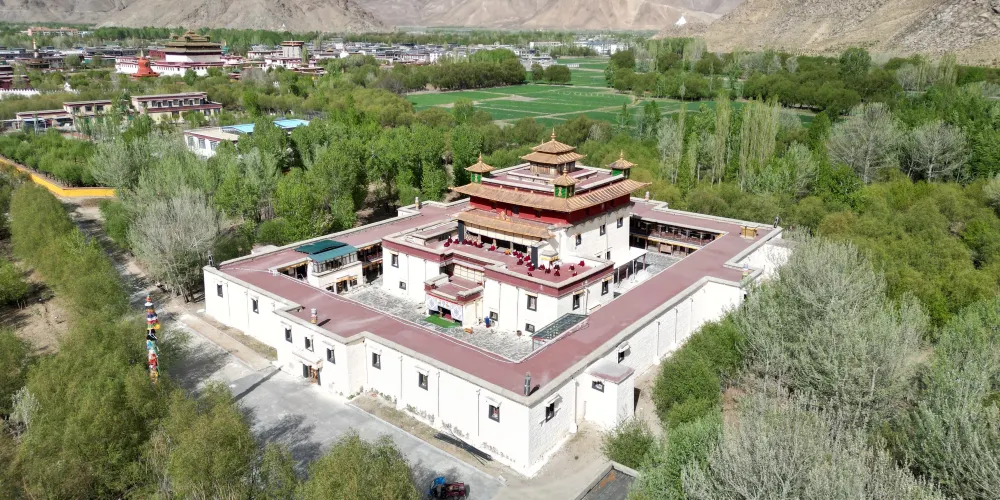 寺院周圍樹木茂盛,葱鬱成林,河渠縈繞,黑頸鶴悠然覓食,可謂世外仙境,高原綠洲。