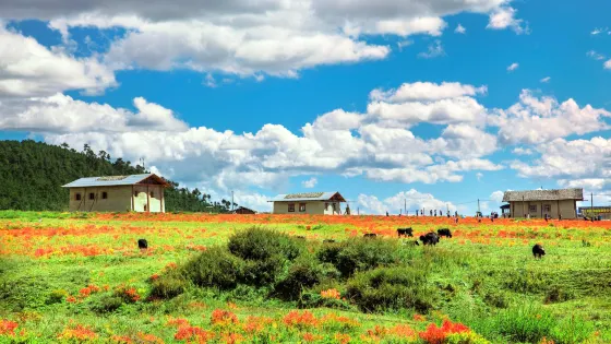 小中甸花海位於麗江前往香格里拉必經的一個小鎮上,地處高寒壩區,有著大片的茂盛草場。而每年初夏,這裡則成了一片花海,多彩的杜鵑花、狼毒花、格桑花,還有各種不知名的小花小草,引得遊人讚嘆不已。而到了秋天,這裡就成了狼毒花的天下。大朵大朵火紅的狼毒花,非常美麗。