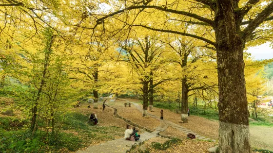 桐子坳位於永州雙牌縣,由於這裡生長著大片銀杏,每到秋季就吸引了大量的攝影愛好者前去,已成為永州一道亮麗的風景名勝。到了桐子坳村,便能看見山中那一大片金黃的銀杏樹林,連綿十多公里,似香山的楓葉般壯闊,滿目金黃,彷若一幅流光溢彩的油畫,令人陶醉。