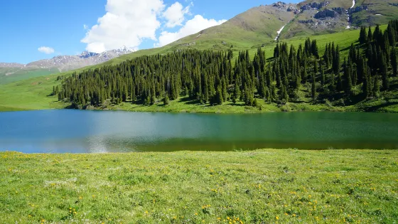 新疆仙女湖民俗文化旅遊景區位於伊犁哈薩克自治州尼勒克縣唐布拉草原的闊爾克山上,海拔兩千多米,宛如一顆璀璨的明珠鑲嵌在天山深處。湖水清澈見底,宛如鏡面,在陽光的照耀下波光粼粼,呈現出迷人的寶石綠色。三面雪山環繞,倒映在湖水中,形成了水天相接、雪山與湖泊交融的優美畫面,彷彿一幅天然的山水畫卷。景區內草原廣袤無垠,野花肆意綻放,紅的、黃的、紫的…… 爭奇鬥艷,宛如一片花的海洋。草原上還點綴著鬱鬱蔥蔥的雲杉林,它們高聳入雲,與草原、湖泊相互映襯,構成了一幅充滿生機與活力的自然景觀。遊客可以騎著當地牧民提供的馬匹,沿著湖邊緩緩前行,欣賞湖光山色的同時,也能感受到騎馬的樂趣。