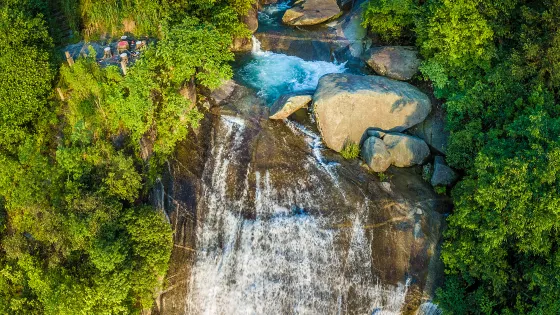 寶鼎瀑布有世界上罕見的特色:花崗岩岩石構成的瀑床,700多米的落差,瀑布腳下有高湖相接。瀑布掛在高聳雲宵的寶鼎嶺腰,長1千餘米,由于山勢陡峭,瀑布共分九級,由完整的丹霞岩石組成,使瀑流猶如在一塊飄浮的紅綢上流過,陽光射過濺起的水霧,七彩如虹,有九重天之說。瀑布最寬處達200餘米,最窄處也有20餘米,總落差180米。每逢春夏之交,瀑布水流量最大。從瀑頂到瀑底,幾經周折,形成九級直落寶鼎湖。飛天瀑布從羅漢大肚式的斷崖處洶湧而下,形成巨大的扇形瀑面,氣勢磅礴,吼聲震耳欲聾。明代旅行家徐霞客贊之曰:“懸崖飛瀑,長如布、轉如傾、勻成簾”。