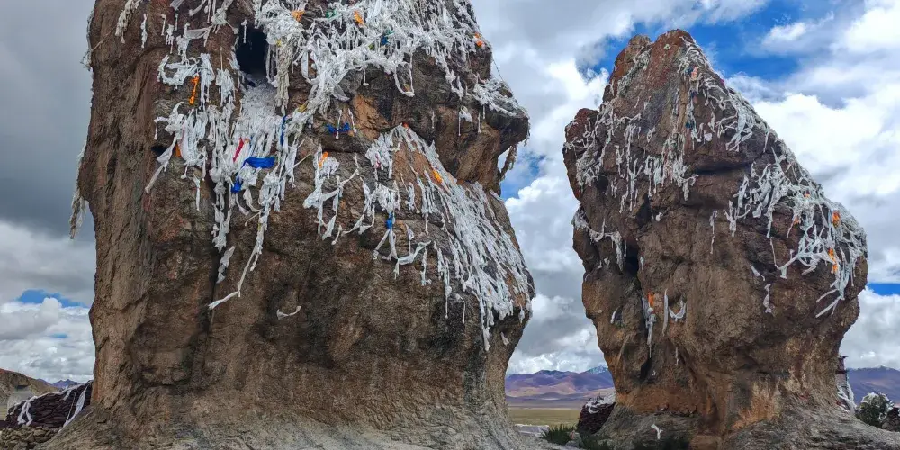 扎西半島,也叫吉祥愛情島,位於西藏當雄縣,是納木錯大的半島,也是遊覽納木錯重要的景點。扎西半島在納木錯湖的東南端,向北延伸到湖中,是個由石灰巖構成的約10平方公里的半島。中間是幾十米高的小山,北端紛雜林立着無數石柱和奇異的石峯,峯林之間還有自然連接的石橋。由於曾長期被天湖水侵蝕,因此,島上分佈着許多幽靜的巖洞,洞裡佈滿了鐘乳石,形成了獨特的喀斯特地貌。扎西島上如此奇異多彩、巧奪天工的地貌,實屬奇觀。扎西半島是納木錯宗教活動為集中的地方,半島上有扎西寺(扎西,藏語意為吉祥的意思),至今仍香煙繚繞,暮鼓晨鐘。半島的轉經路旁,有一個很大的山洞,稱之為蓮花生洞,據説洞裏有自然生成的蓮花生靈塔。沿着半島的轉經路到湖邊,首先看到的是路邊的迎賓石。無數條長扎西半島迎賓石長的經幡從山頂飄落下來,把巨石裝扮的五彩斑斕。迎賓石是兩塊溶蝕石,也稱為夫妻石,是納木錯的門神。