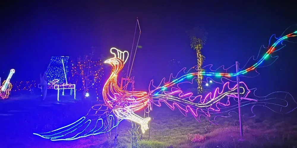 峰林曉鎮的娛樂項目豐富多樣,涵蓋了刺激冒險與休閒愜意的不同選擇。熱愛冒險的遊客,能在峰林飛翔中,藉助專業裝備高速掠過峰林,感受風馳電掣的快感。鐘情休閒的遊客,不妨搭乘峰林觀光小火車,慢悠悠地穿梭於花田與桃林,3公里的軌道、20分鐘的行程,盡享悠然時光;或是乘坐熱氣球緩緩升空,從高空俯瞰峰林全貌,體驗浪漫氛圍。吶喊噴泉則充滿趣味,遊客通過呼喊控制噴泉高度,增添互動樂趣。此外,還有蓮湖遊船、侏羅紀探秘公園、夢幻冰雪等項目,能滿足各類遊玩需求。