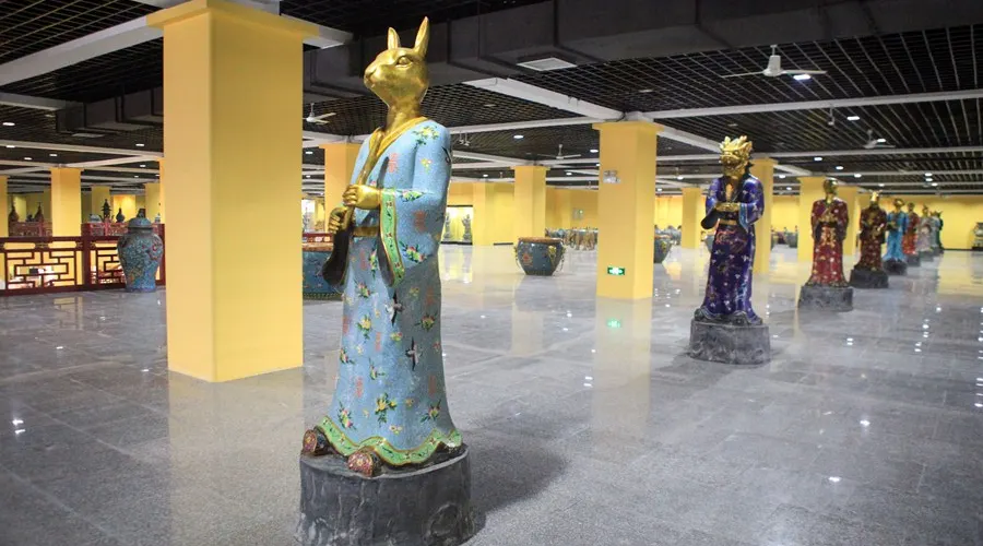 【十二獸首噴泉】 圓明園十二生肖獸首銅像鑄造於清朝乾隆年間,由宮廷西洋畫師意大利人郎世寧主持設計,法國人蔣友仁監修,宮廷匠師製作。郎世寧以十二生肖的坐像取代了西方噴泉設計中常用的人體雕塑,十二生肖獸首銅像就此誕生。這些銅像不僅是噴泉,還具備報時功能,象徵一晝夜的十二個時辰,每個時辰相當於現今的兩小時。它們在噴水池兩側按規律呈扇形排列,銅像中空連接噴水管。每到一個時辰,代表該時辰的獸首口中