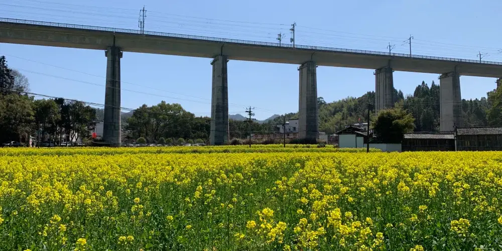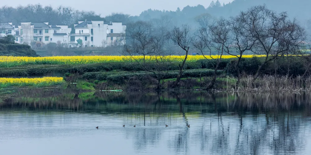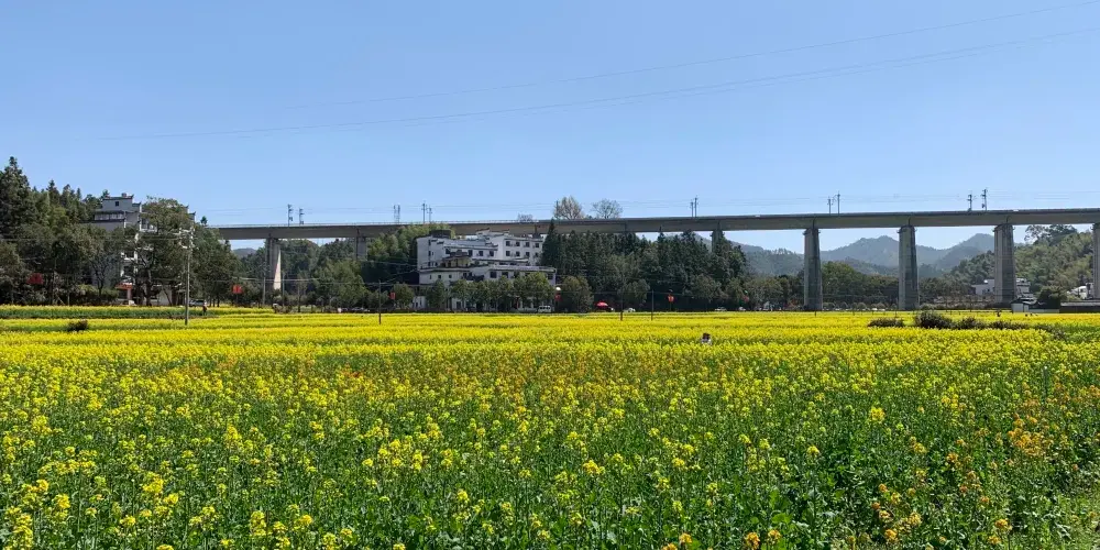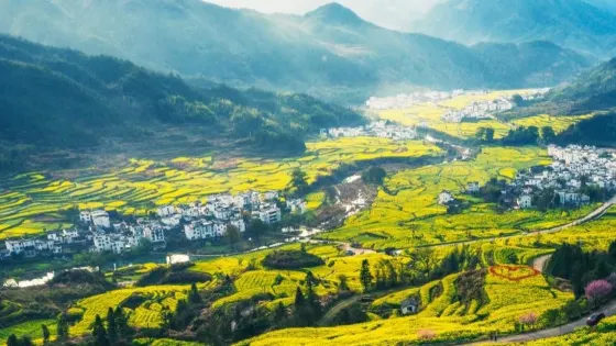 李坑是個四面環山的水鄉小村,村前是大片的油菜花田,入春後滿山遍野的金黃,村內溪河兩岸多傍有徽派的古建築,灰牆白瓦十分古樸素凈,村裡還保存着南宋武狀元李知誠的故居。來這裏賞油菜,俯瞰是好的方式,沿着村後的小路上山,登上制高點,便可縱覽全景。