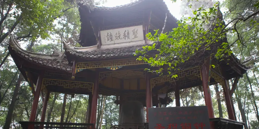 沿鳳凰堡之字形坡道上去,便可見紅柱六角重檐鍾亭,亭額懸“聖積晚鐘”橫匾,裏面銅鐘為明代嘉靖年間別傳禪師所鑄,重12.5噸,高2.3米,口徑2米,鍾脣為12缺荷葉形。鐘上刻有一些經文、歷朝部分帝王和高僧的名諱等。聖積晚鐘,為四川省峨眉山“峨眉十景”之一。該鐘曾懸掛在南門外的聖積寺內。近聞之,聲洪壯;遠聞之,聲韻澈;傳靜夜時可聲聞金頂。認為鐘聲可以“警醒頑愚”,自我反省,檢討自己的過失,規正自己的行為。所以寺裏的鐘頗有講究。這口銅鐘便是峨眉山的佼佼者,被譽為“巴蜀鐘王”,是一件很珍貴的文物。1959年,聖積寺廢,鍾擱置於道旁。1978年,峨眉山有關文化部門將銅鐘遷移到報國寺對面的鳳凰堡上,並建亭覆蓋維護。