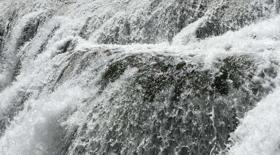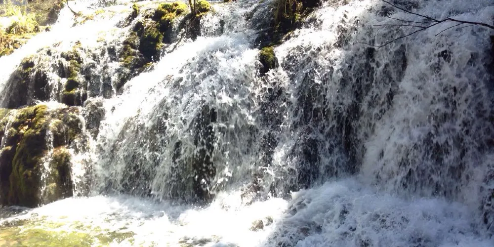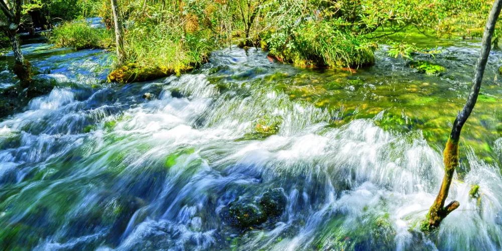 上游珍珠灘瀑布的激流,在凹凸不平的乳黃色鈣化灘面上濺起無數水珠,陽光下,點點水珠就像巨型扇貝里的粒粒珍珠,遠看河中流動着一河潔白的珍珠。這就是珍珠灘。珍珠灘上密佈的淺黃色苔蘚很是奇特,它們並不滑膩,赤腳踩在上面就像踩在海綿上一樣。幾年前,遊人還可涉灘戲水,親自體驗珍珠灘的神奇,現在衹能在岸邊觀看,不能下水,遊客可通過棧橋穿過石灘。
