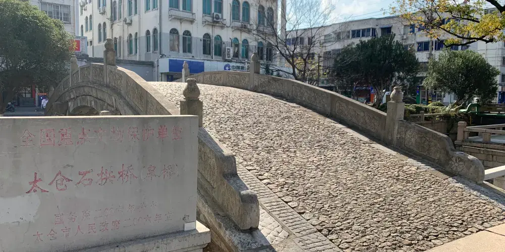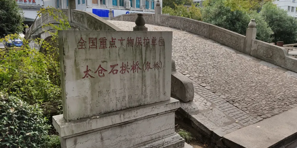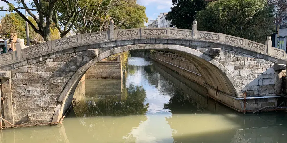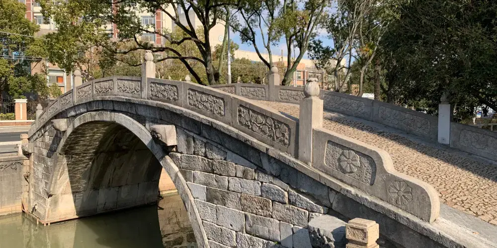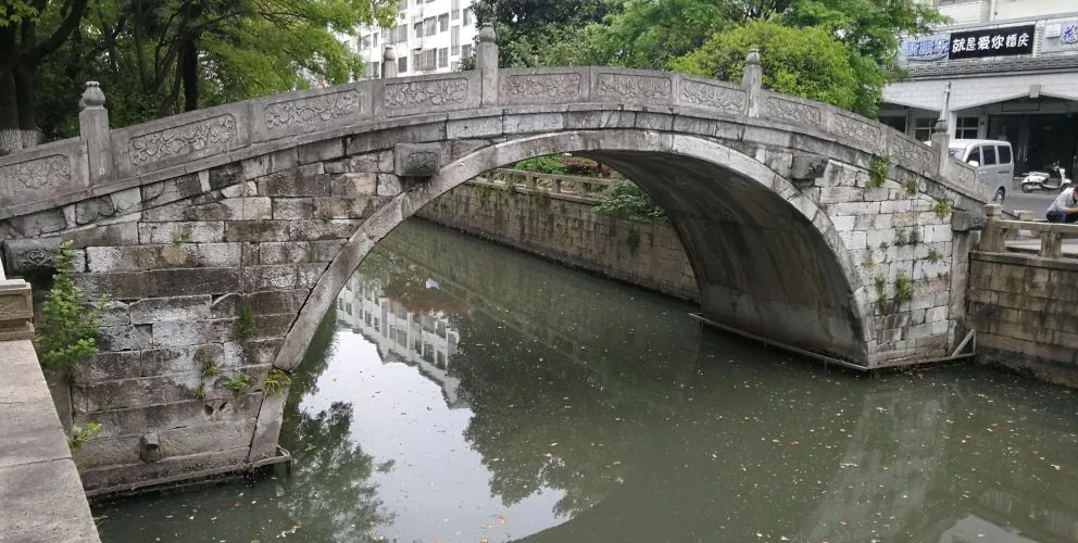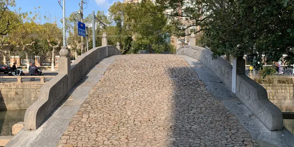 皋橋,建於元統二年(1334年),本名興福橋。橋長15.05米,寬4.23米,高4.4米。可能單孔關係,顯得較高,故又俗稱高橋。古漢語中"皋"通"高"字,為顯其雅意,文人愛把高橋別稱為皋橋。皋橋的正中地幅一側刻有八卦圖案,拱石上還刻有花卉,早年橋身上長有枸杞等多種小樹,平添古意。