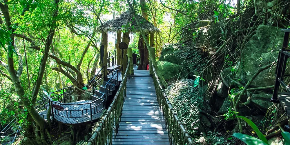 雨林谷綠林蒼翠,仙霧瀰漫,是一座隱匿的林中仙境,年平均溫度24度,溫暖宜人,匯集參天巨榕、百年古藤及雨林六大奇觀等景觀。雨林谷遊覽通道由木棧道、石階、吊橋組成,長達3.5公里,分為大、中、小三個環行線路,滿足各類人群的遊覽需求。