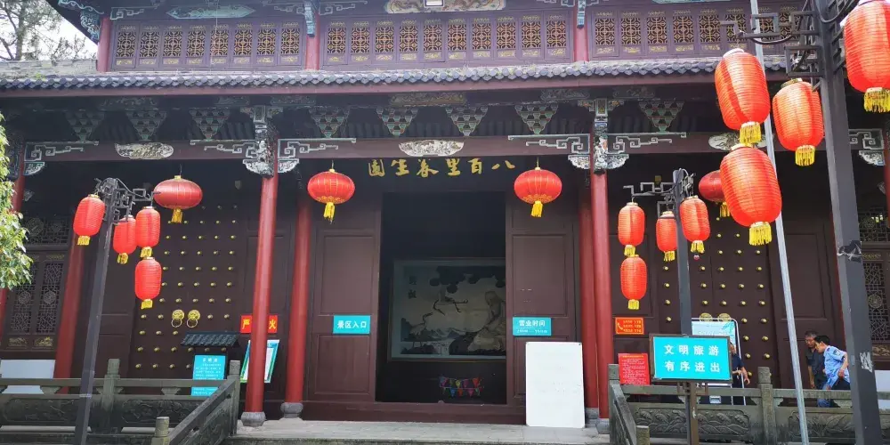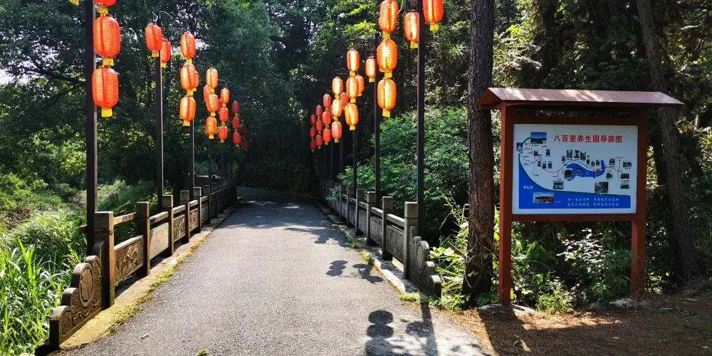 八百里風情島,擁有豐富多彩的建築種類,景區內的青山湖水上森林景緻獨特,勘稱天下一絕。遊客在這裏,可以蕩舟水上森林,觀賞“樹在水中長,船在林中游”的獨特景觀。傳説活了八百歲的上古長壽鼻祖彭祖曾在臨安青山湖畔的此地居住過,因此得名八百里。區崗巒簇集,起伏跌宕;沿湖溪流蜿蜒,水灣幽靜;山野林木繁茂,景觀秀美。景區內從浙、皖、閩等地蒐集來的100餘幢江南古建築組合成了一條古色古香的商貿老街和一個經妙絕倫的古村落。其間建築品類豐富多彩,衙門、廟宇、戲台、祠堂、書院、亭子、民居等古建築錯落有致,交相輝映。景區內精美的石雕、磚雕、木雕以及巧妙的建築結構佈局向遊人展示了一部古代江南建築史。