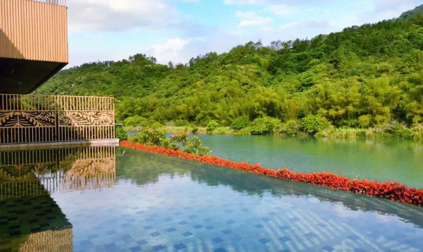 無邊際泳池位於河畔溫泉區,依河而建,提供自然沉浸式的體驗。從泳池可眺望寧靜的流溪河與雄偉的飛閣山。得益於無邊際設計,泳池看似無邊無際,與河流完美融為一體。