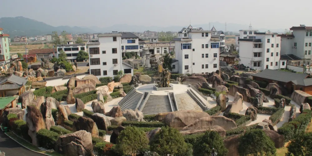 常山石博園位於常山縣青石鎮的320國道和048省道石文化景觀帶交匯處,園內馬頭牆,小青瓦和石雕石刻裝飾,都帶有明顯的徽派特徵,這也是中國觀賞石博覽園園區的建築風格,同時還採購南方各地古石材石雕,比如青石板,生活工藝品石雕如石桌、石凳等,古建石雕如石柱、石欄、石闕、牌坊等;古代石制器皿如石斧、馬槽、旗桿石墩等,用於建設園區內的三衢古街和精品古街,再現原汁原味的歷史老街文化氛圍。