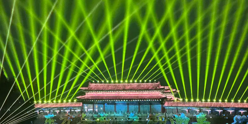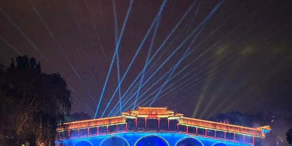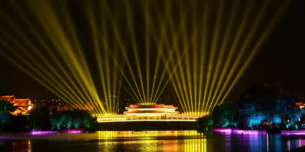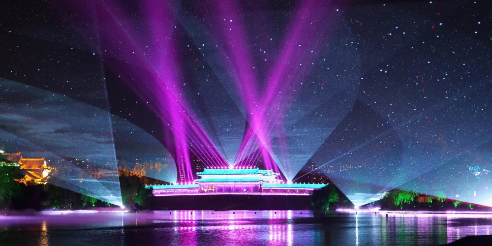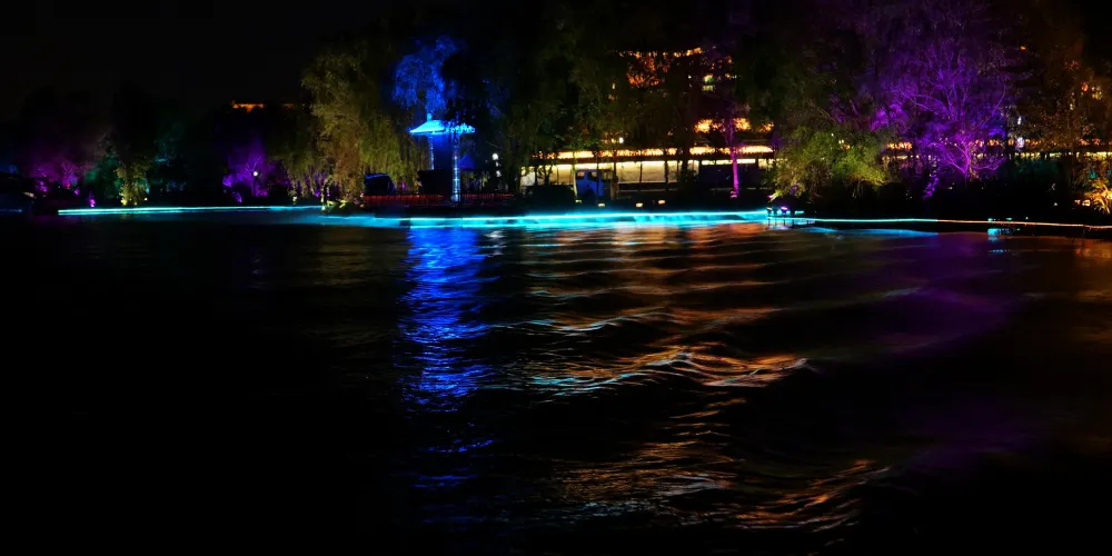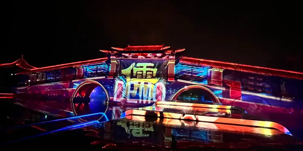 夜遊的精彩之處,是一場別開生面的“水幕全息投影”。以蓼河噴泉為幕布,利用先進的投影技術,將孔子的生平事蹟和魯國文化的精髓呈現在遊客面前。隨着影像的變換,蓼河上空出現了孔子周遊列國、講學論道的畫面,讓遊客們彷彿穿越到了那個充滿智慧與哲理的時代。