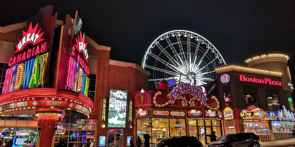 克利夫頓山位於加拿大尼加拉瀑布附近,是瀑布城裡人氣很高的商業娛樂街區。整條街充滿卡通風格的大型招牌和霓虹燈,氣氛熱鬧,適合邊逛邊玩。街上有各種娛樂景點,例如蠟像館、恐龍高爾夫、摩天輪和室內遊樂場,也有不少適合家庭的餐廳和小吃店。這裡也是購買紀念品的好地方,店家種類多,從紀念T卹到巧克力都有。非常適合和朋友或家人一起安排半天輕鬆行程,逛街、拍照、玩樂一次滿足。