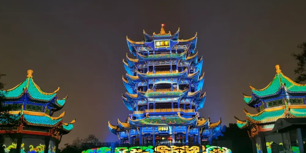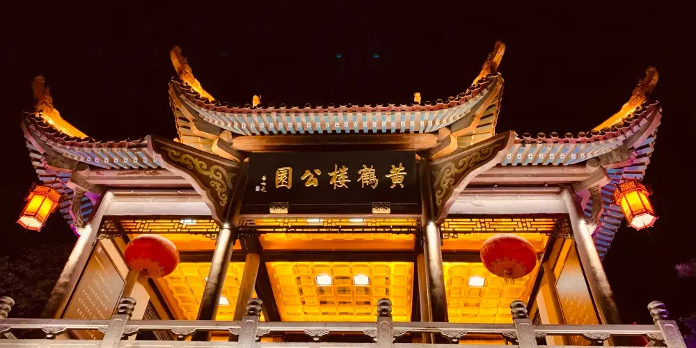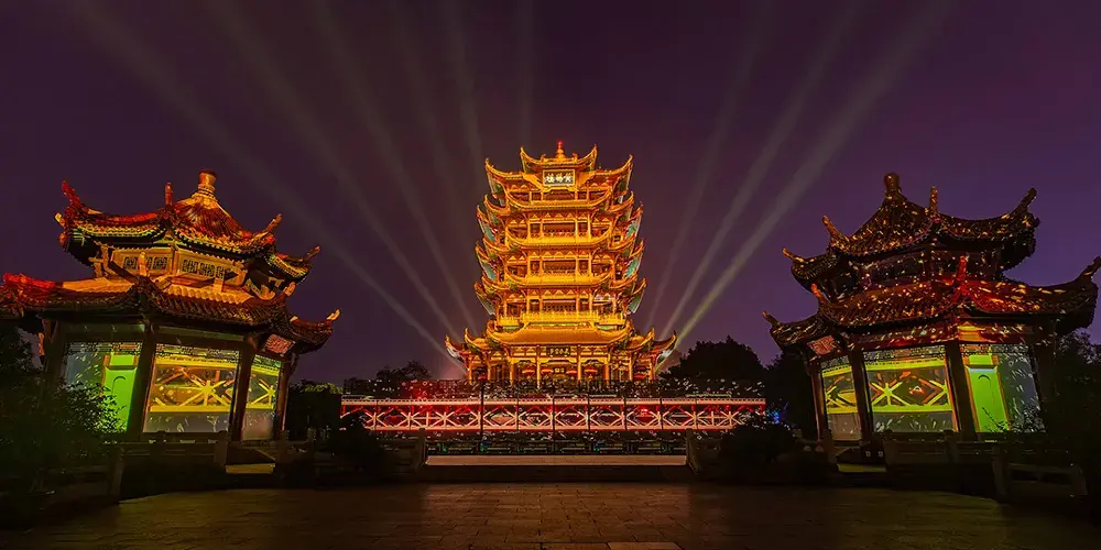 《夜上黃鶴樓》由武漢市園林局、武漢旅遊體育集團聯合黃鶴樓公園共同打造,是集實景化、行浸式、體驗型於一體的文化旅遊演藝,也是黃鶴樓1985年重建落成以來開放夜間遊覽。項目以黃鶴樓公園為載體,圍繞其獨特的歷史文化,採用聲光電結合的手法,融入藝術表演與遊園模式,透過高科技光影技術打造的城市地標夜遊新體驗。